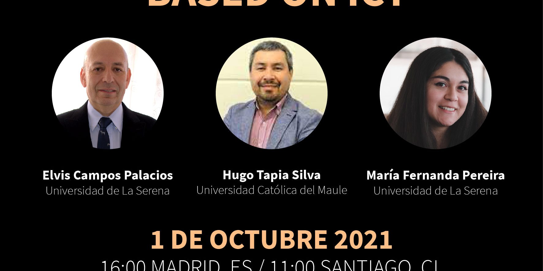 27.09.2021.Lic. Elvis Campos Palacios, profesor de Inglés de la Carrera de Pedagogía en Inglés, Hugo Tapia Silva, ex profesor de Ped. en Inglés y la egresada 2021 de la Carrera, Srta. María Fernanda Pereira participarán como expositores en las XI Jornadas Internacionales de Campus Virtuales de la Universidad de Salamanca. La actividad se realizará el día 01 de octubre de 2021, a las 11:00 horas, Santiago de Chile (16:00 horas España).